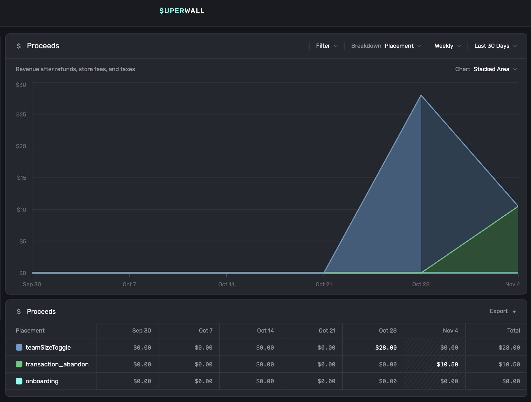 Breaking down a Proceeds chart by Placements is a powerful way to directly correlate features you make (or similar things you've paywalled) to your app's revenue growth.