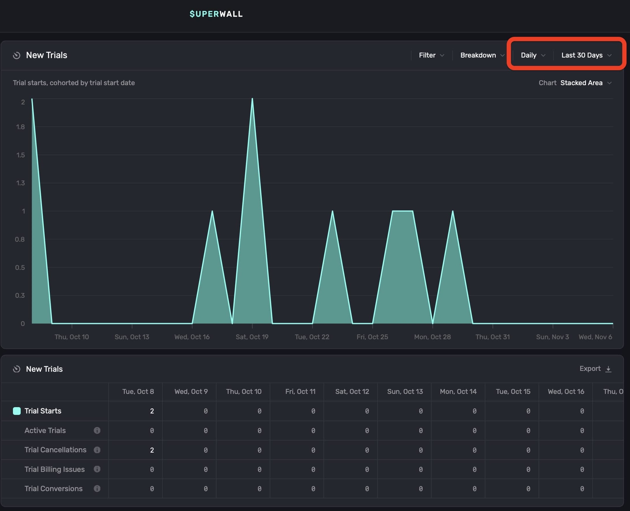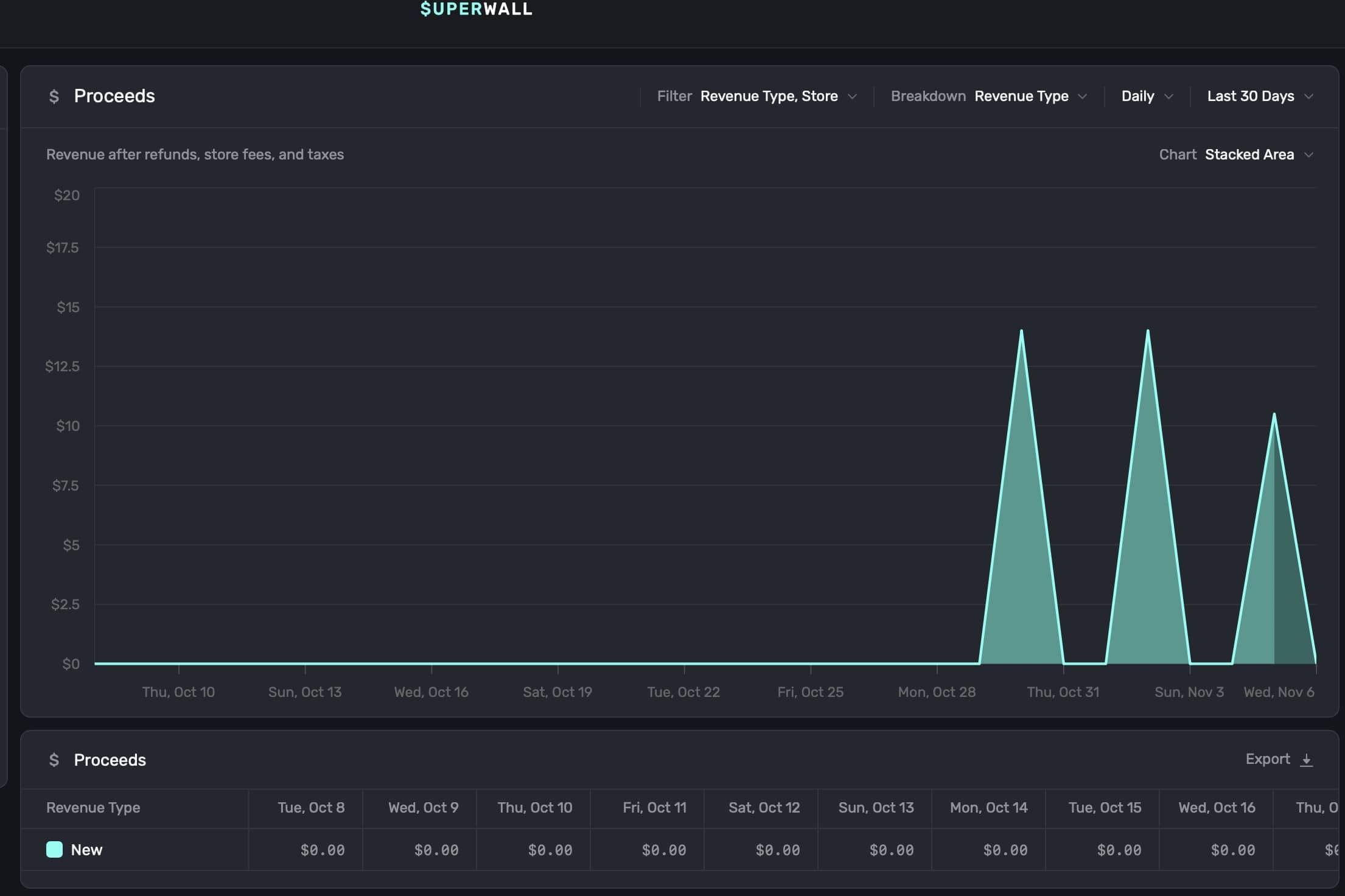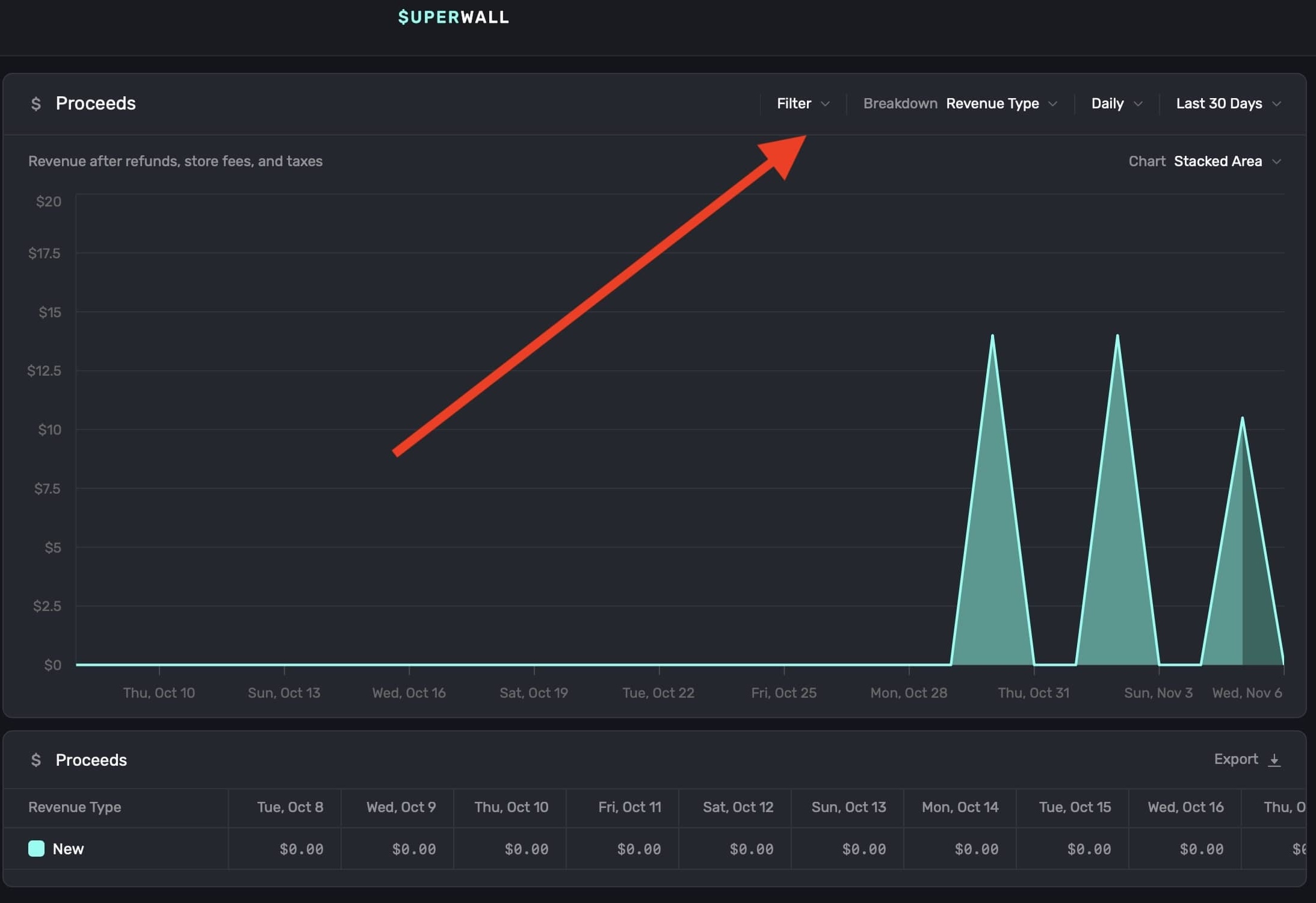 • Cohorted Proceeds: Net proceeds cohorted by Install Date, after refunds, taxes, and fees. Usually used in comparison to Ad Spend. Only includes revenue generated by Superwall.