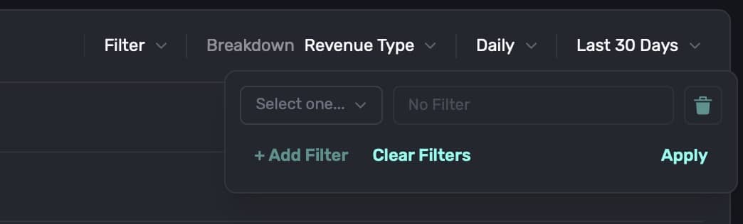 Filter data by choosing a filter type and clicking on + Add Filter to apply it. You can add one, or several, filters: