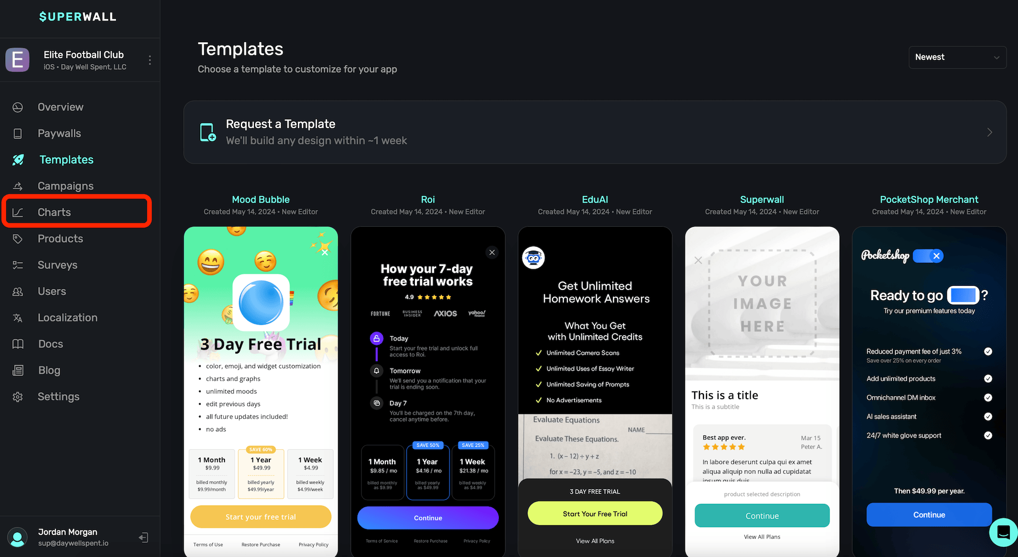 View charts detailing important metrics about your app's subscription performance, paywalls and more.