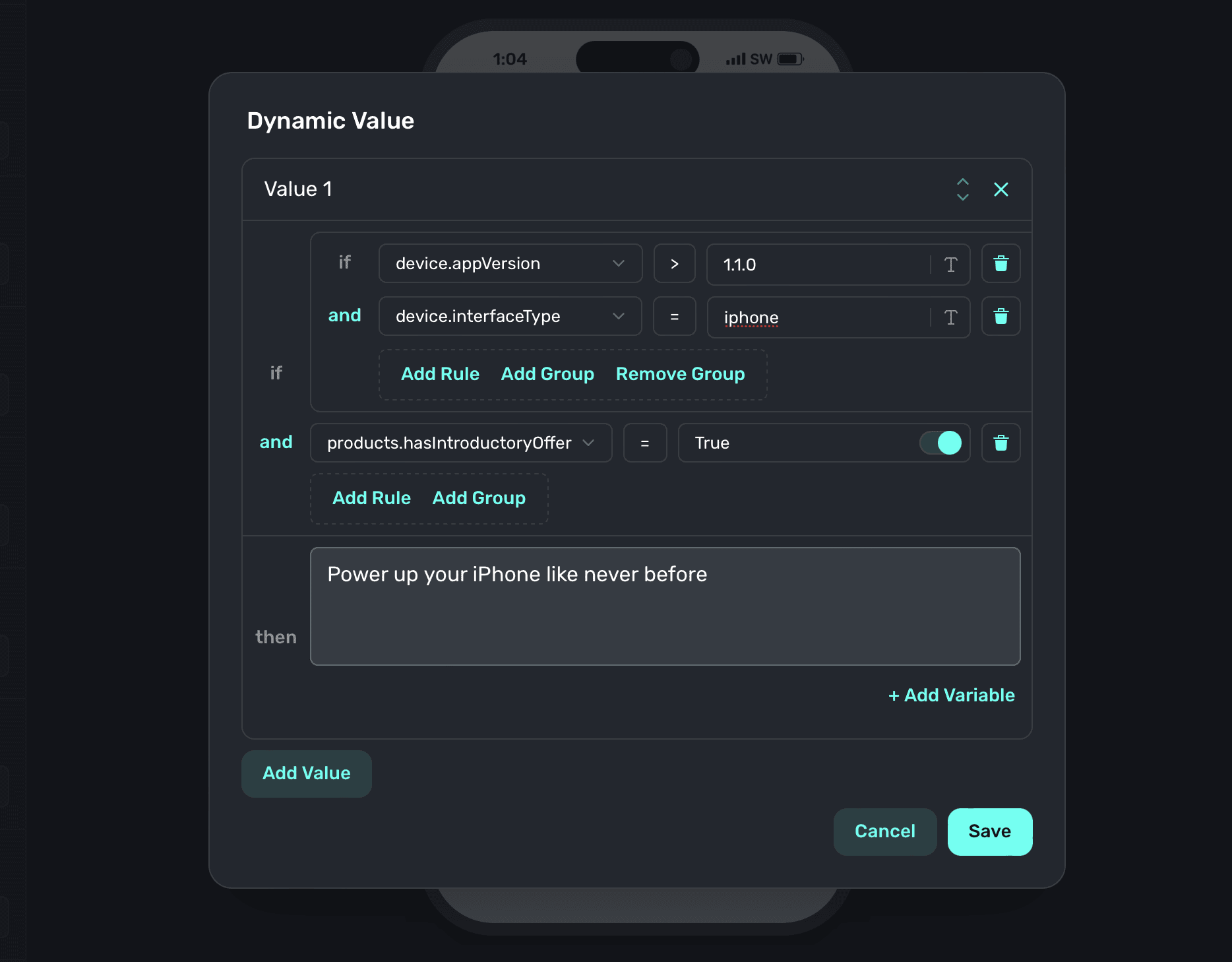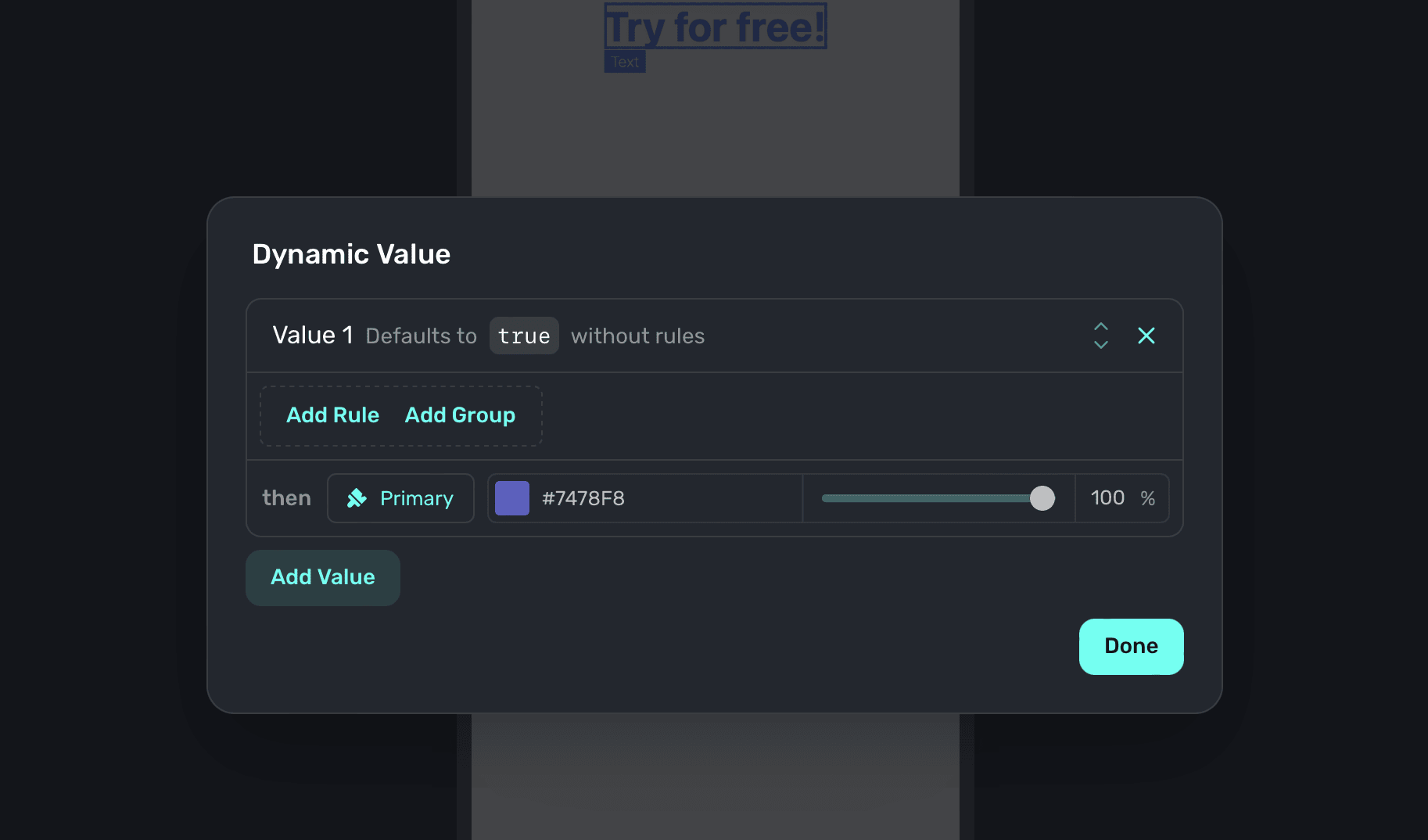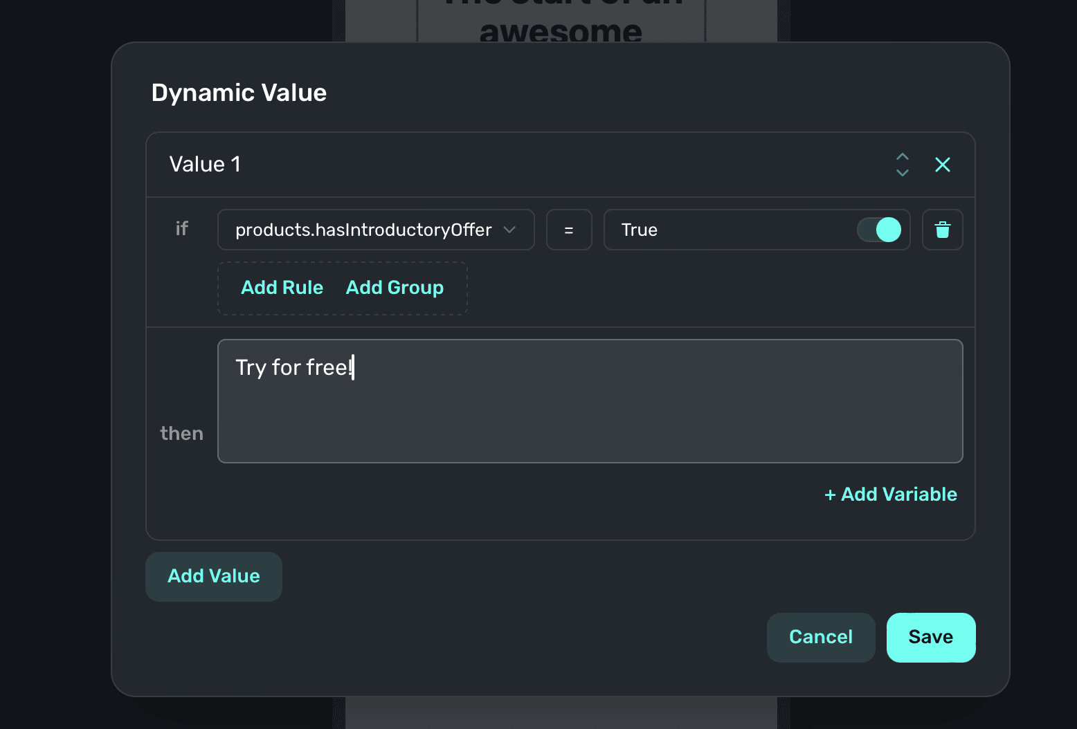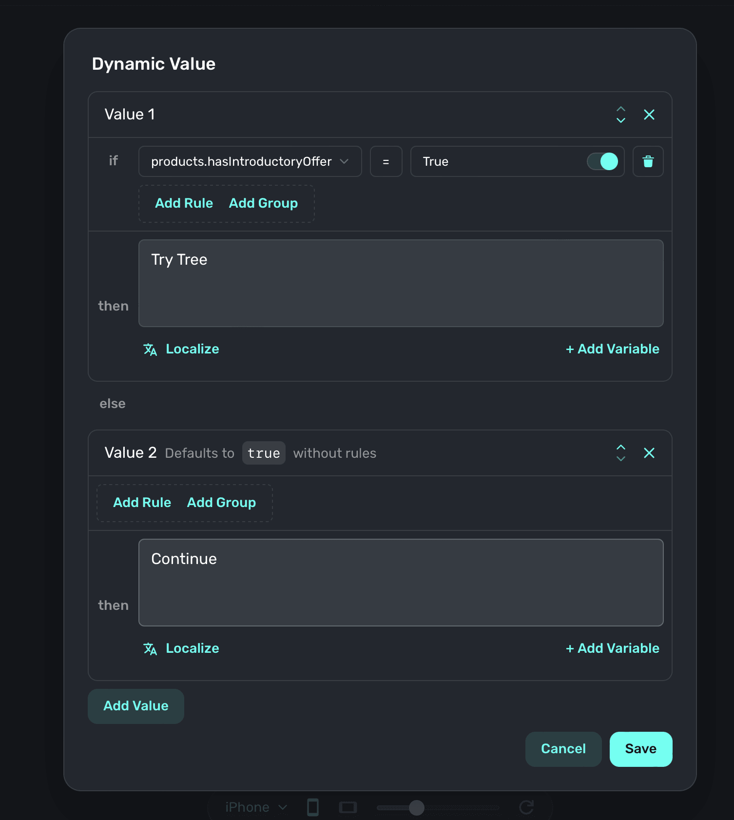 The dynamic values editor works like most control flow interfaces. You set a condition, and choose what should happen when it's met. You can chain multiple conditions together, too. Or, simply use an if/else format.