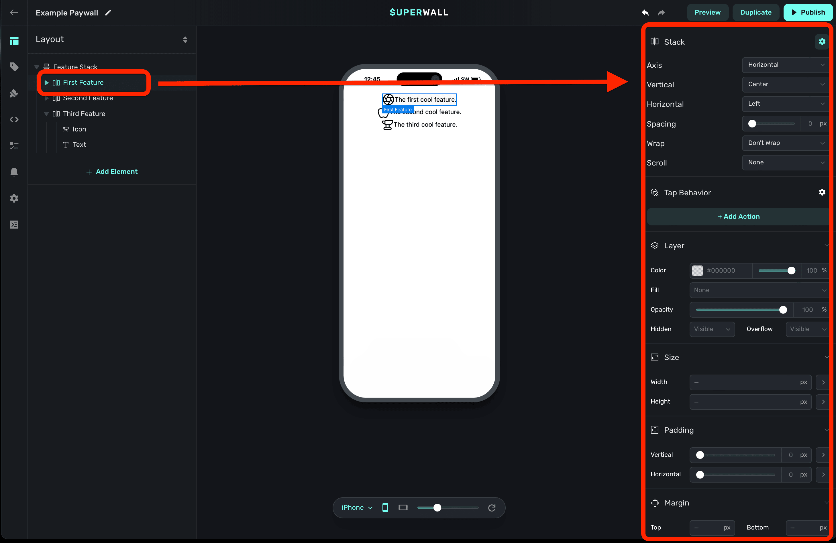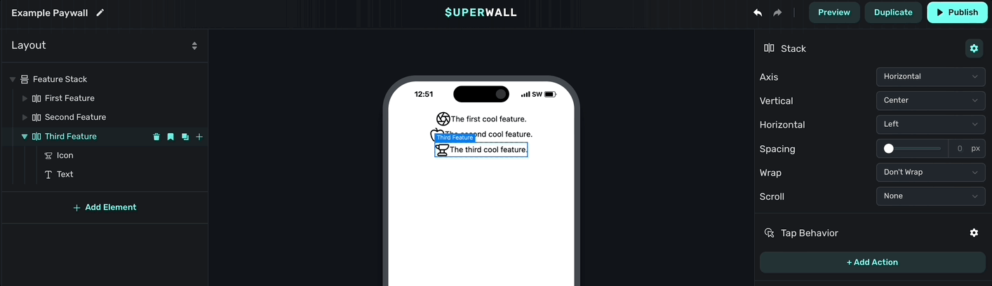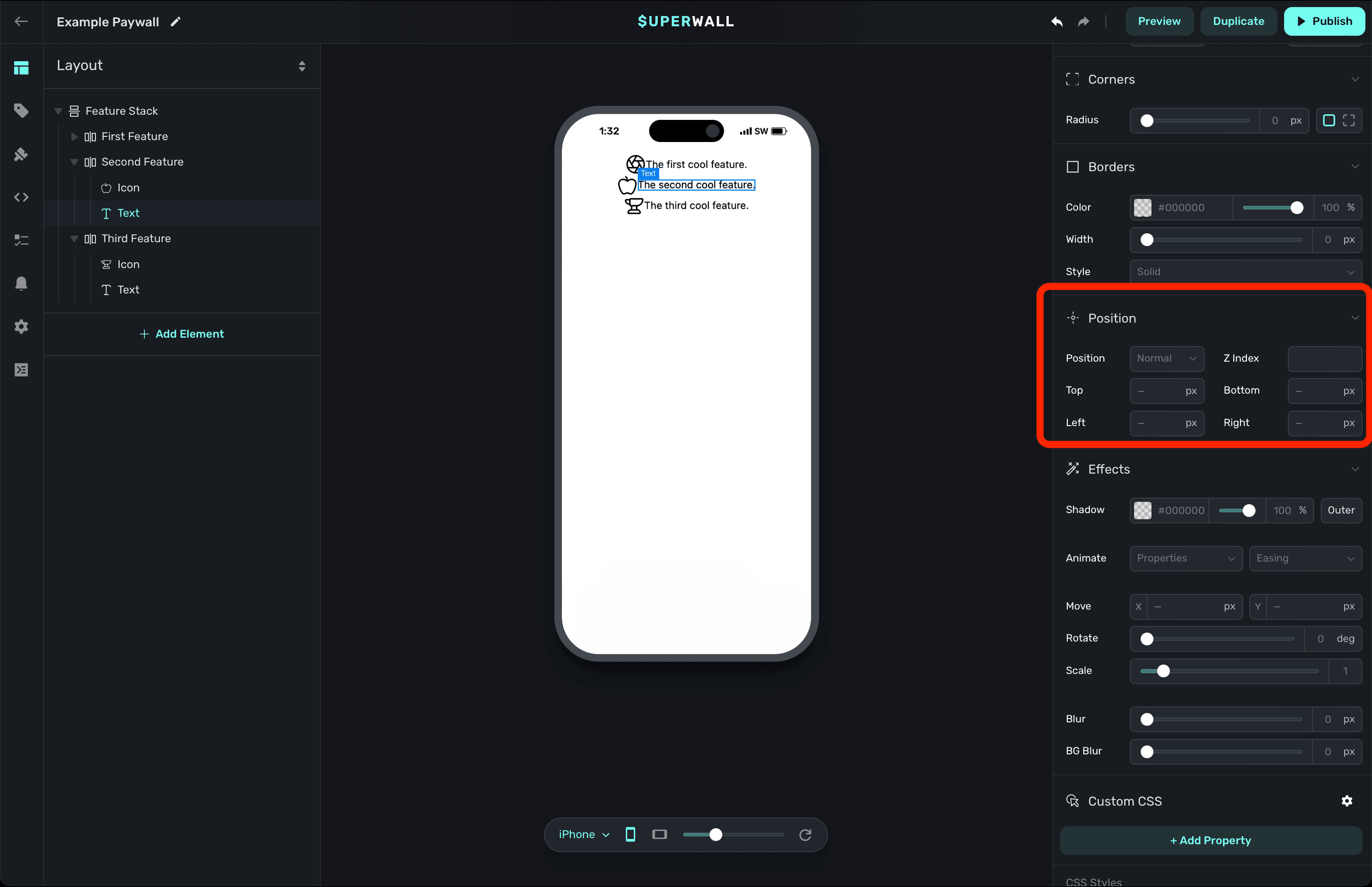 - Absolute: Removes the component from the normal paywall hierarchy flow and positions it relative to its nearest positioned component (which won't necessarily be a parent component).