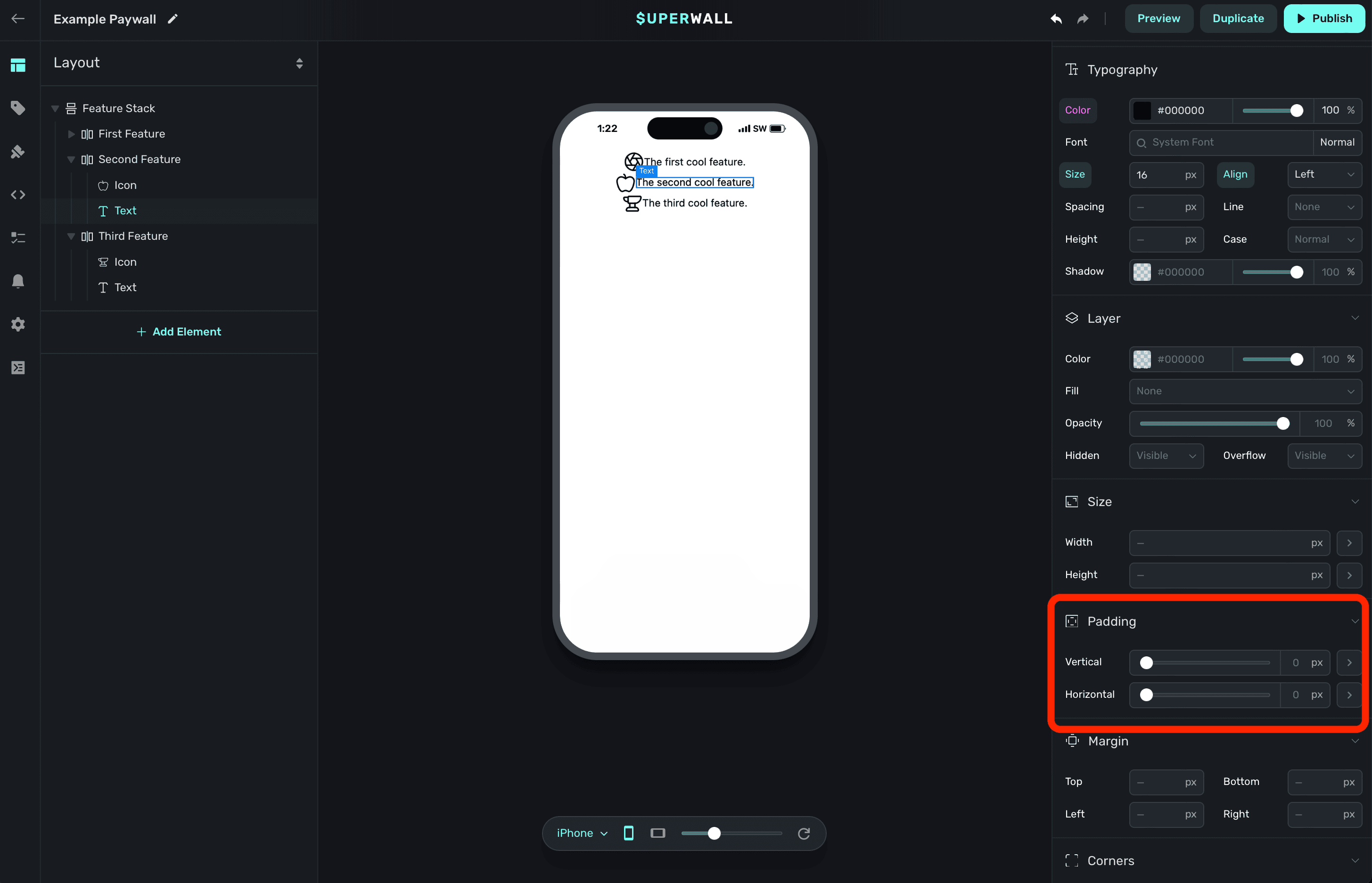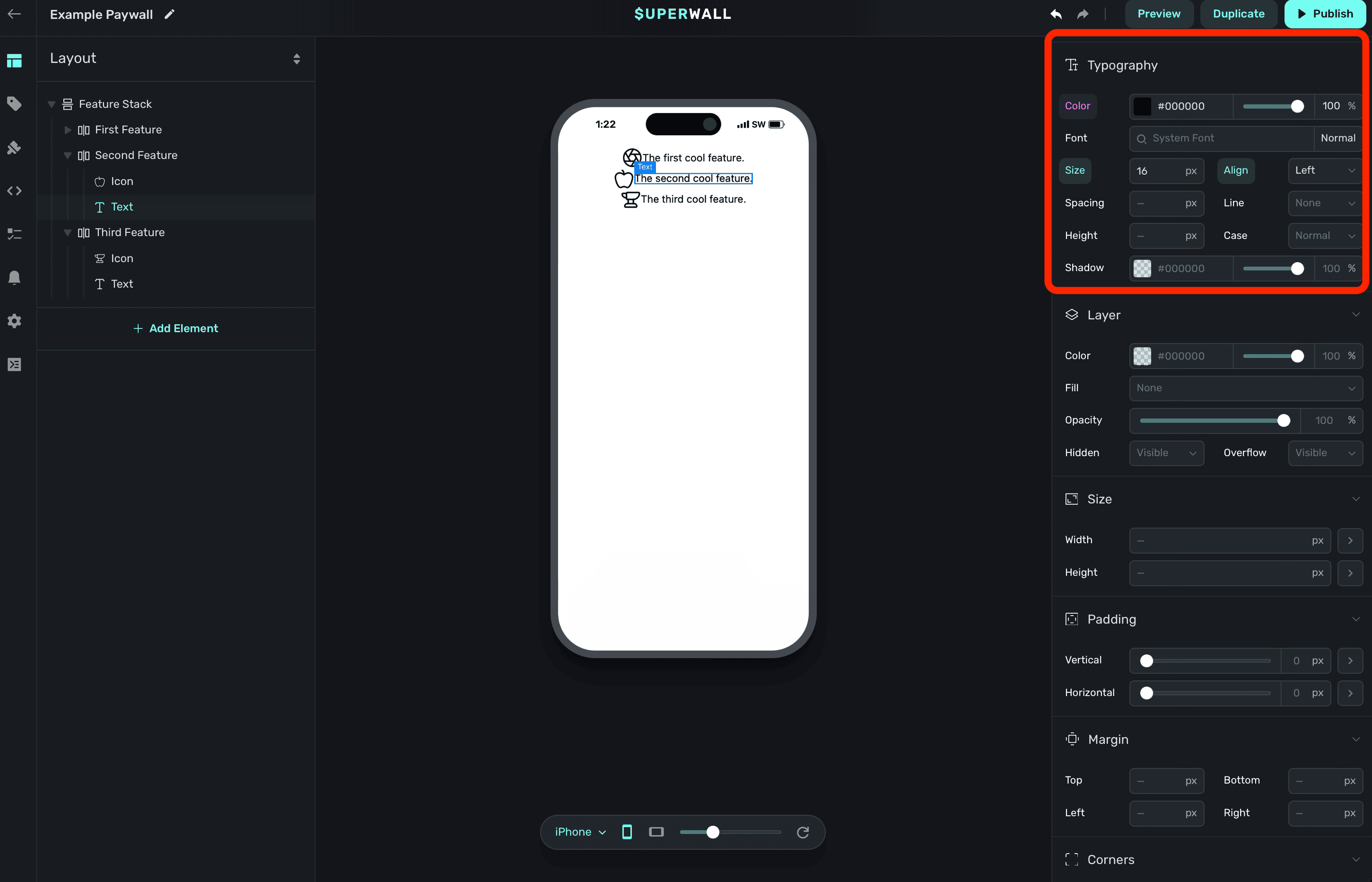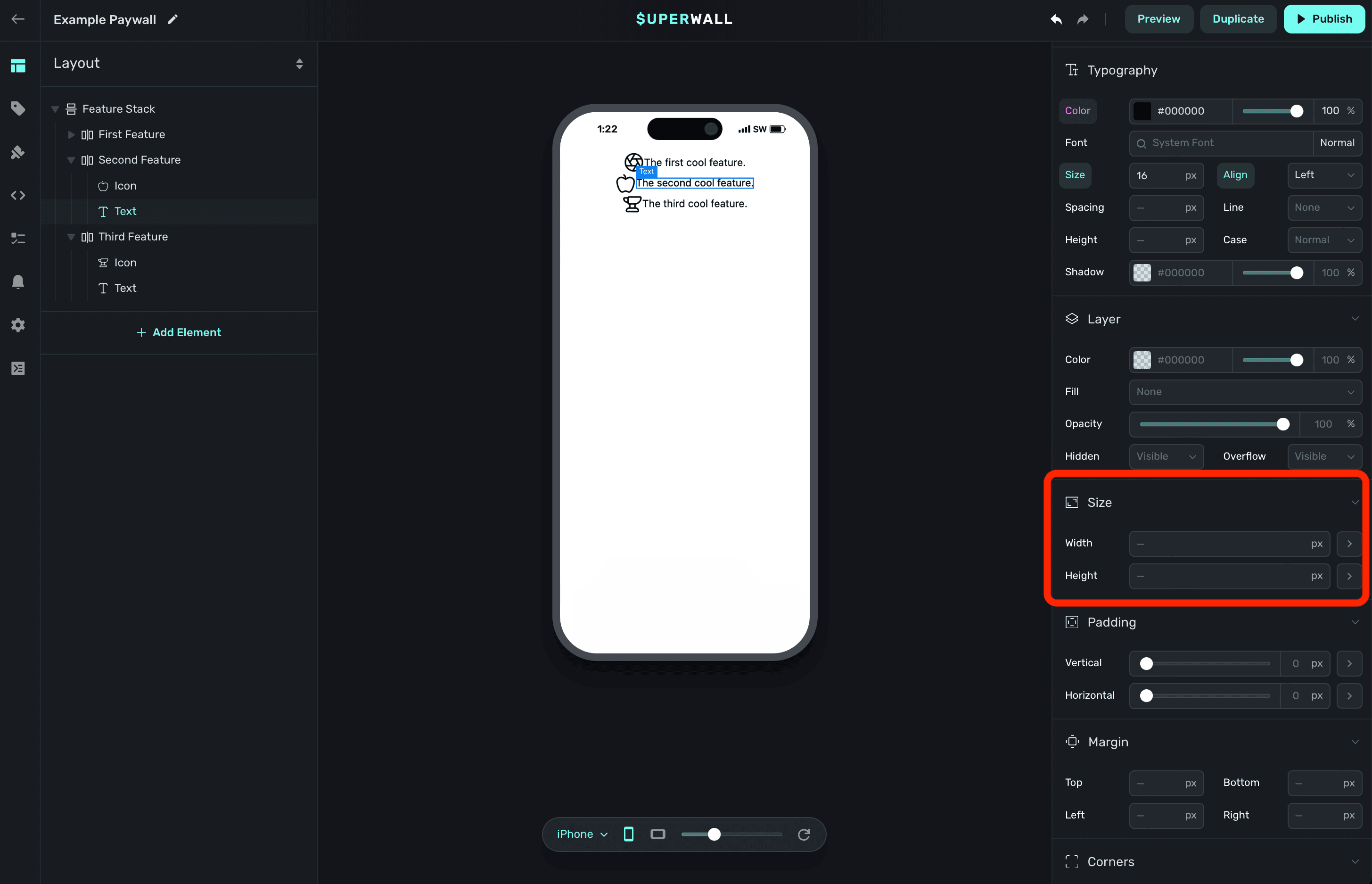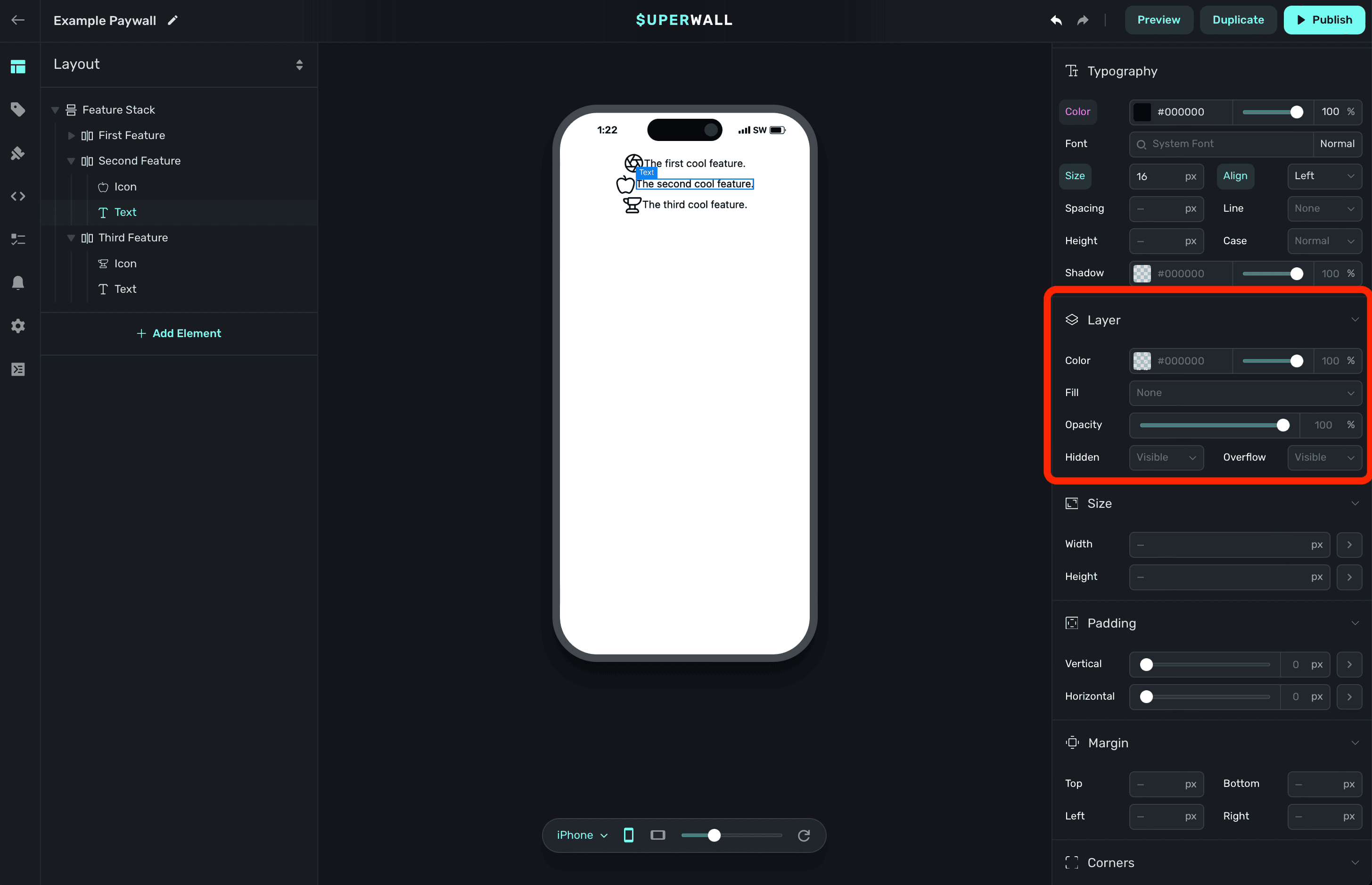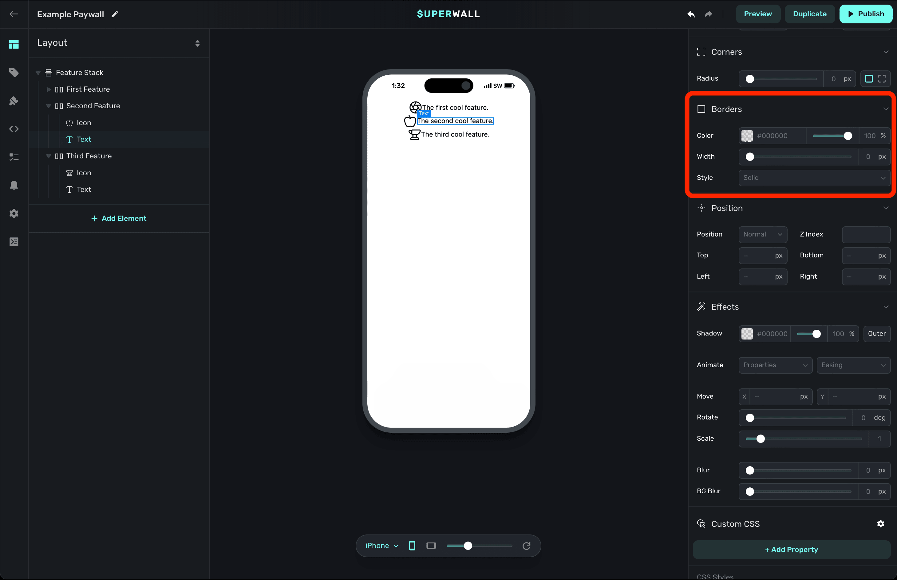 The properties below are editable regardless of which kind of component you are editing. The most important thing to keep in mind is that all of the properties below will work the same as they would on a web page. When you change these properties, behind the scenes — Superwall is applying the corresponding CSS code to the paywall.