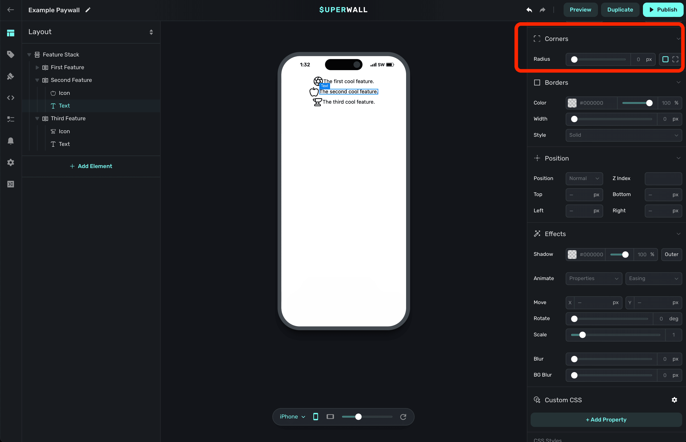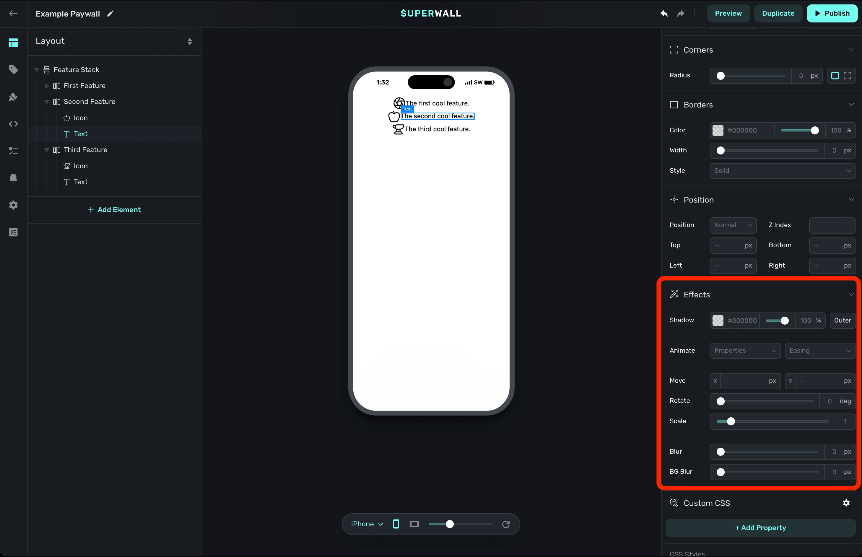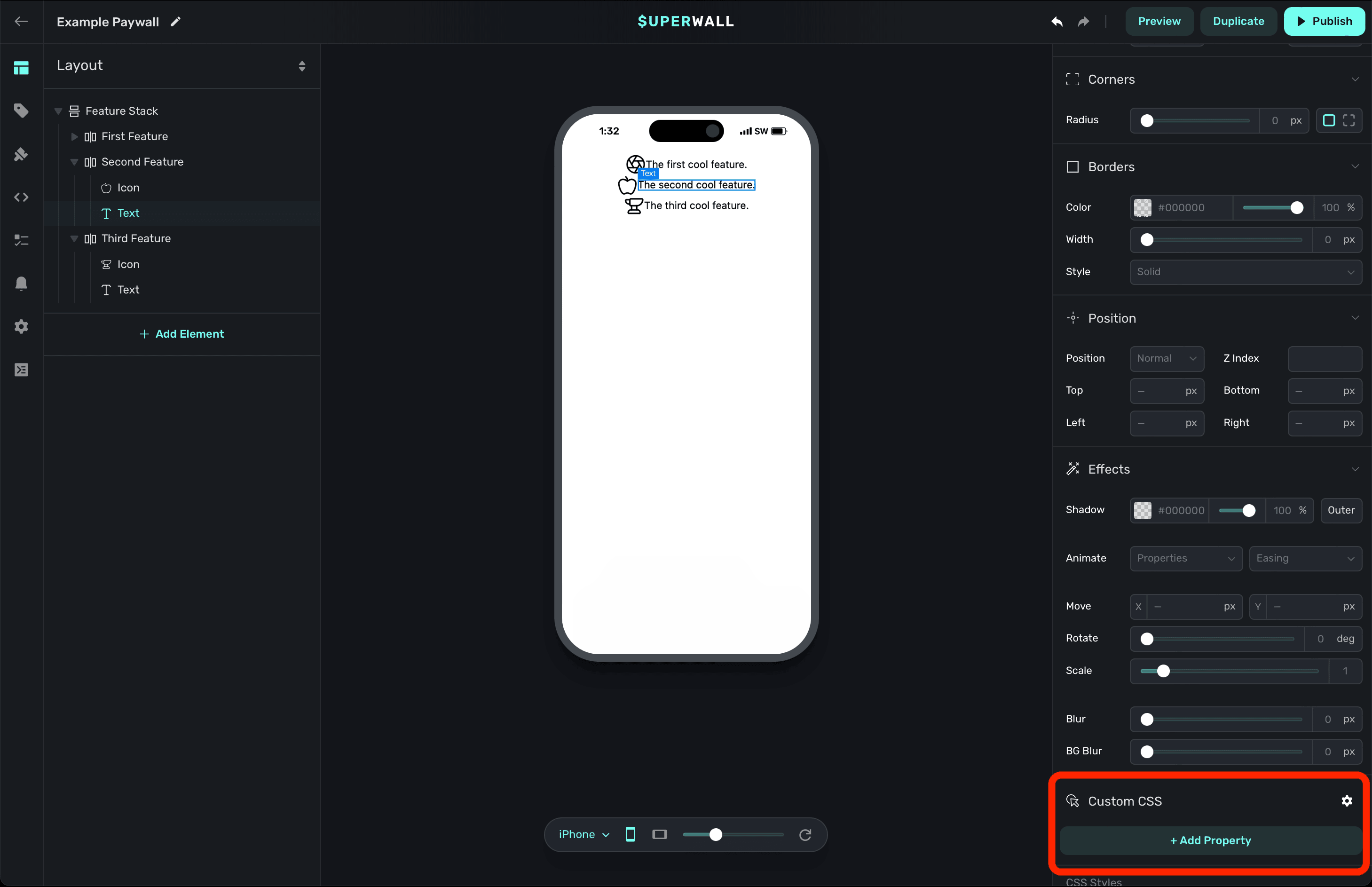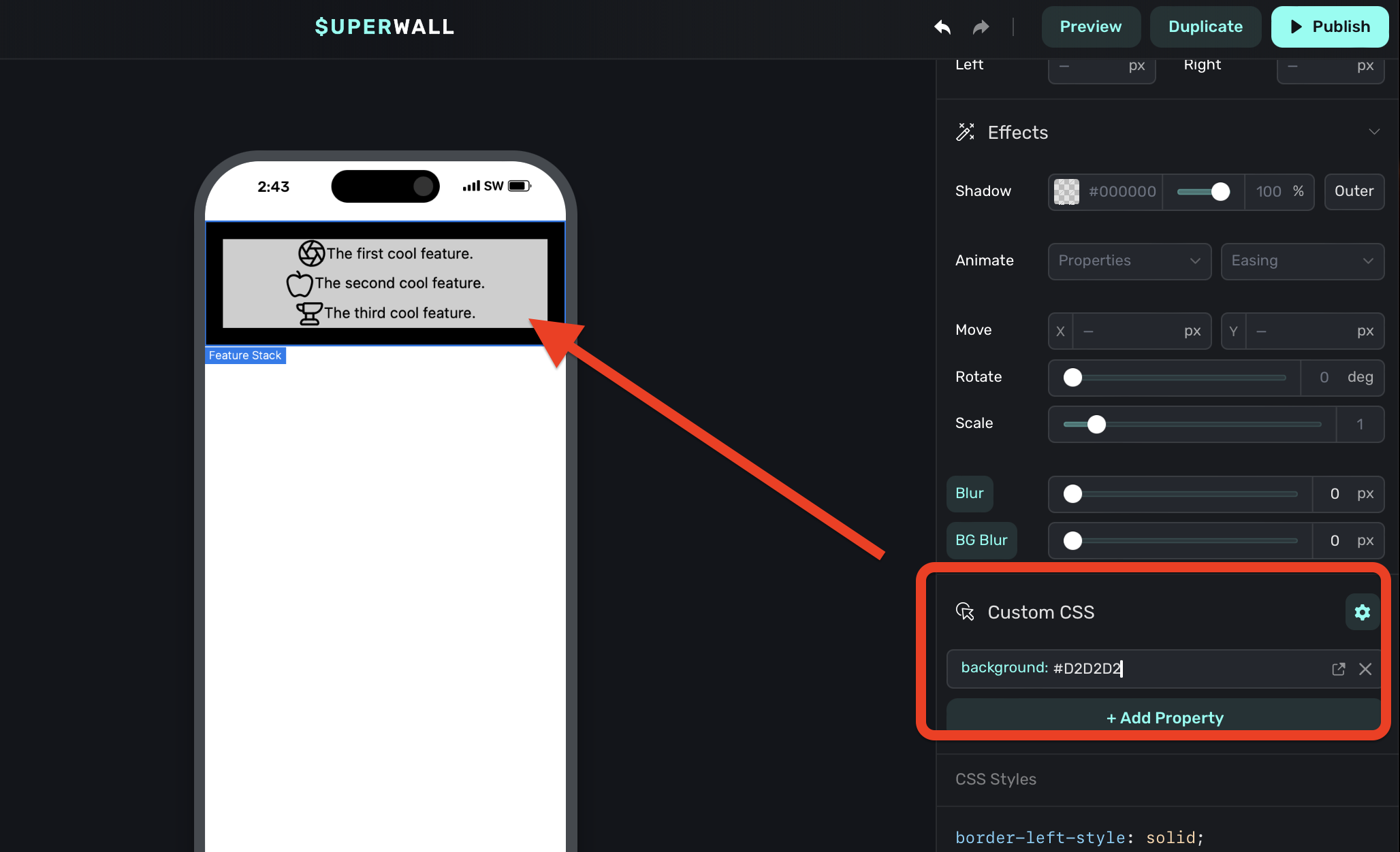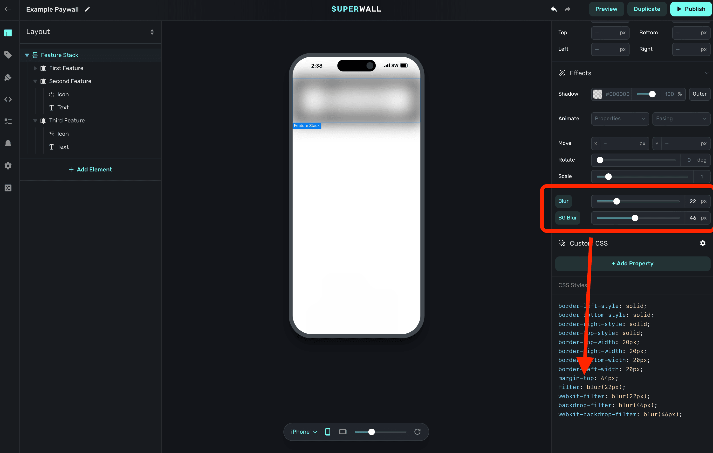 As you make any changes to these properties, you can see the actual CSS that Superwall is applying by scrolling down in the component editor to the CSS Output section: