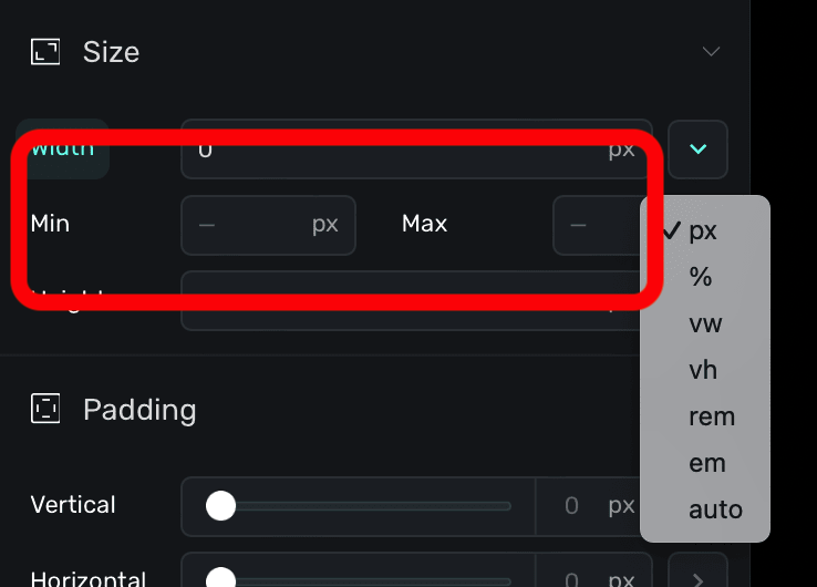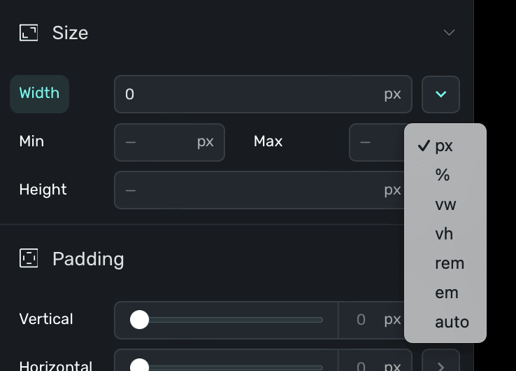 Note that for any property that deals with editing a particular size, you can click on the disclosure arrow to choose a specific unit (such as rems):