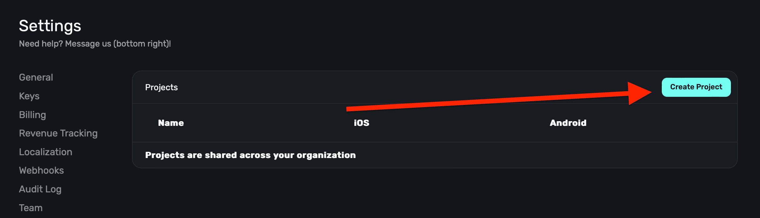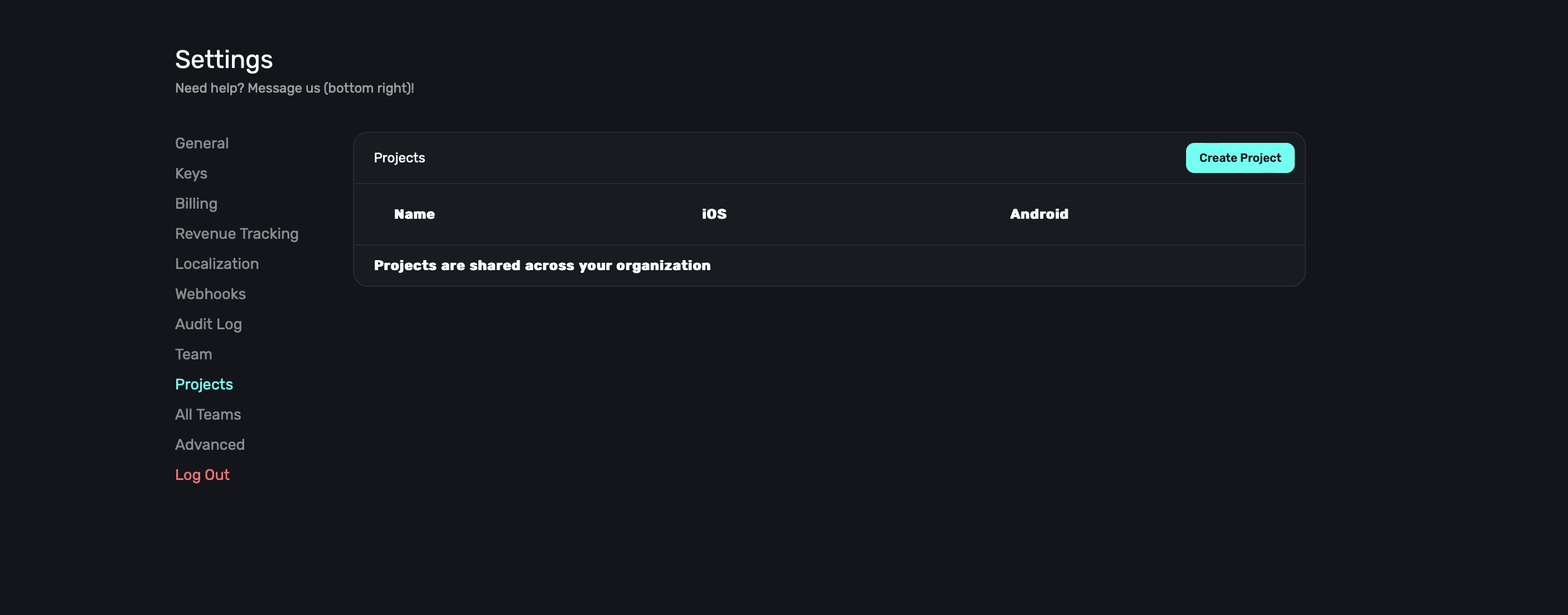 After you've created a project, you can select an app for the iOS and Android platform by clicking their respective buttons: