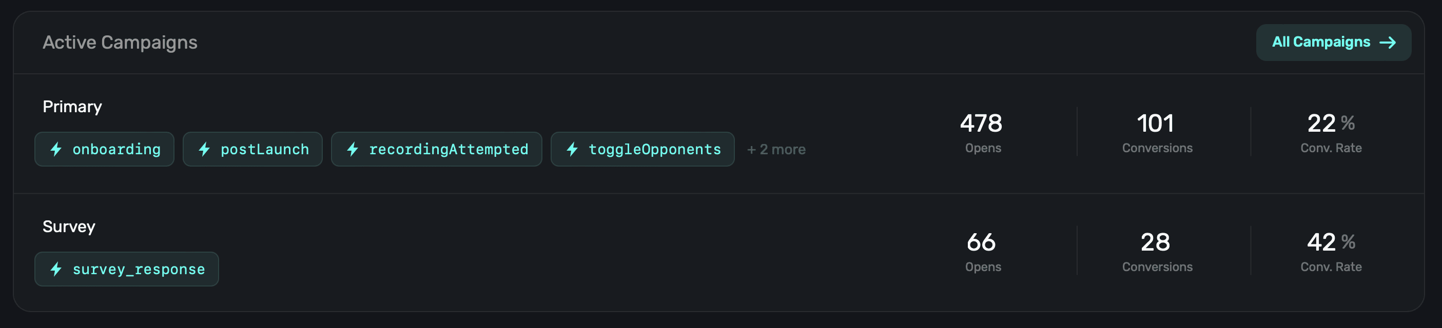 Click on any campaign to dig deeper into them. If you would like to view all campaigns (active or paused), click All Campaigns at the top-right. Learn more about campaign here.
