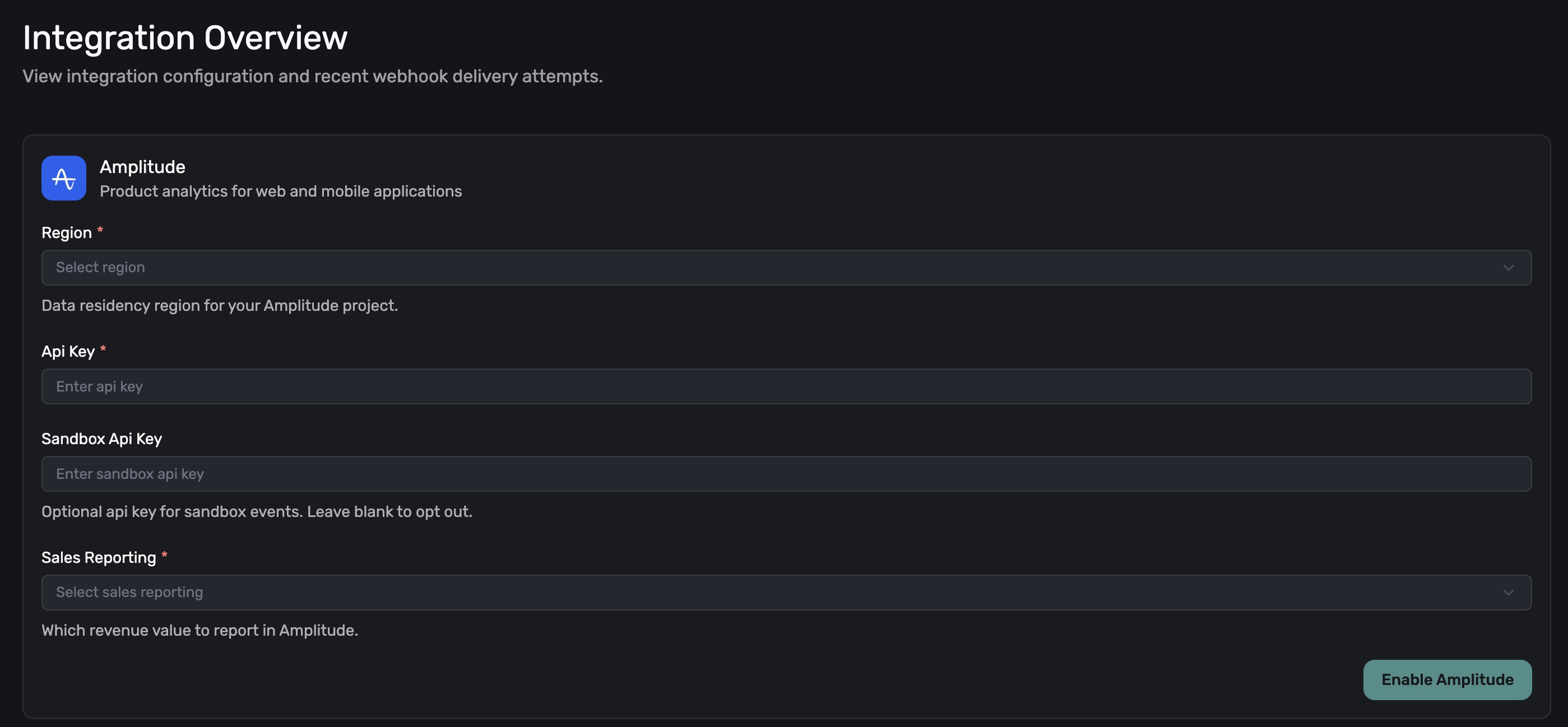 In the Analytics section within Integrations, you can connect your Amplitude account to Superwall: