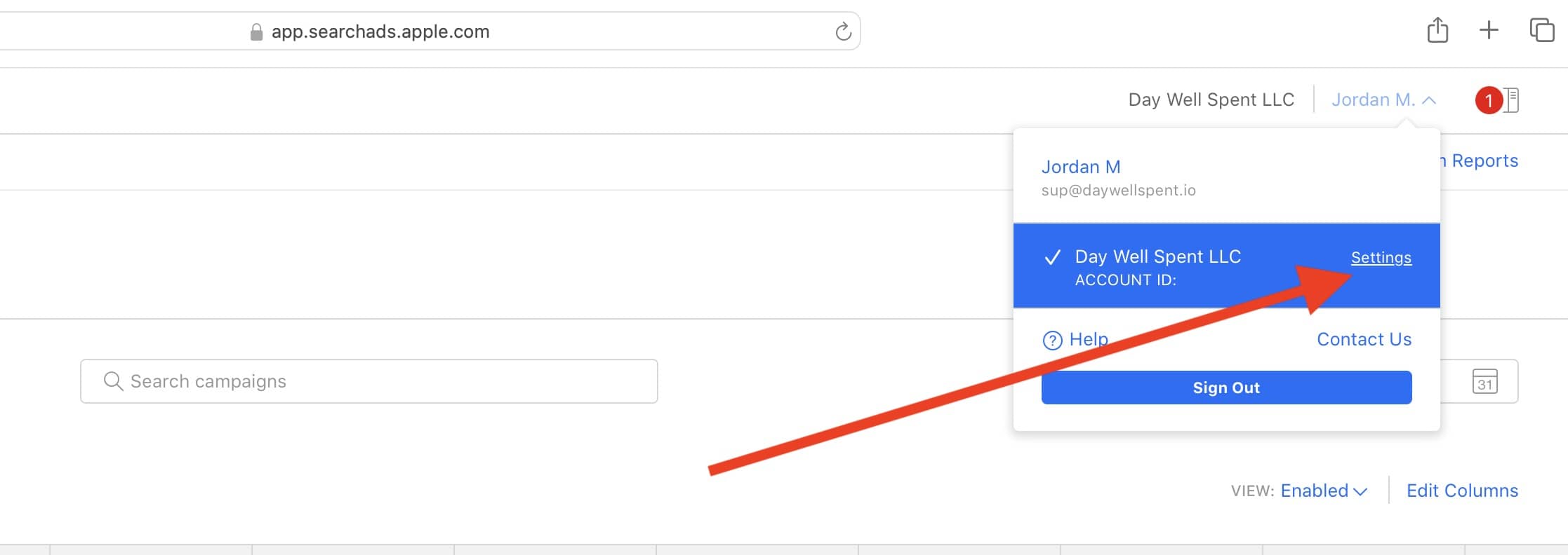 - Go to searchads.apple.com and click Sign In -> Advanced.