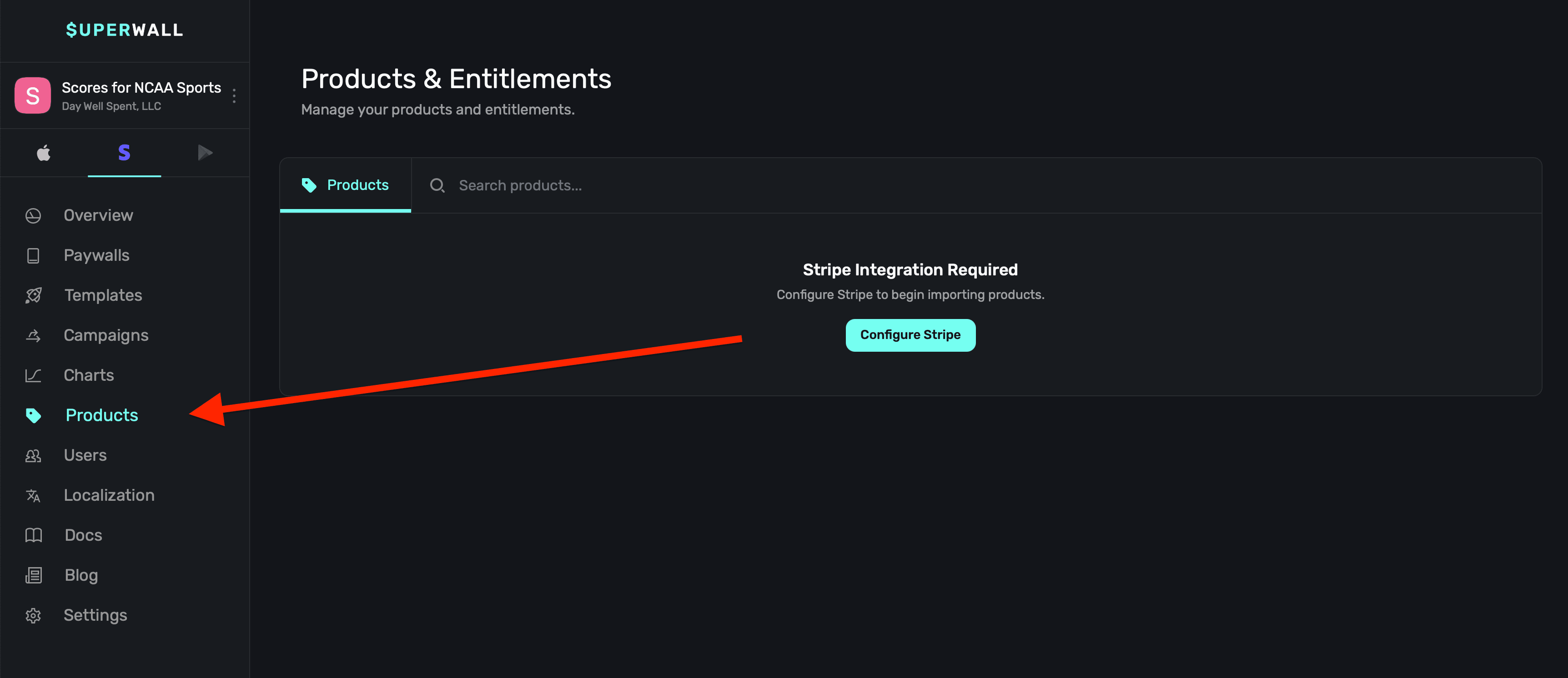 Once your app is configured with Stripe or Paddle, you can create products in your provider of choice to show on your web paywalls. To get started, click on Products from the overview page: