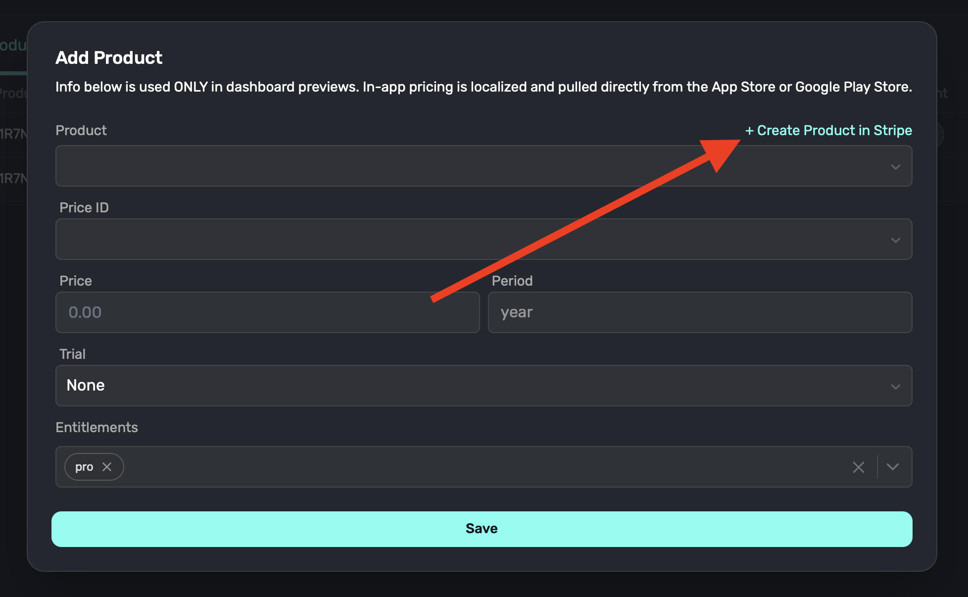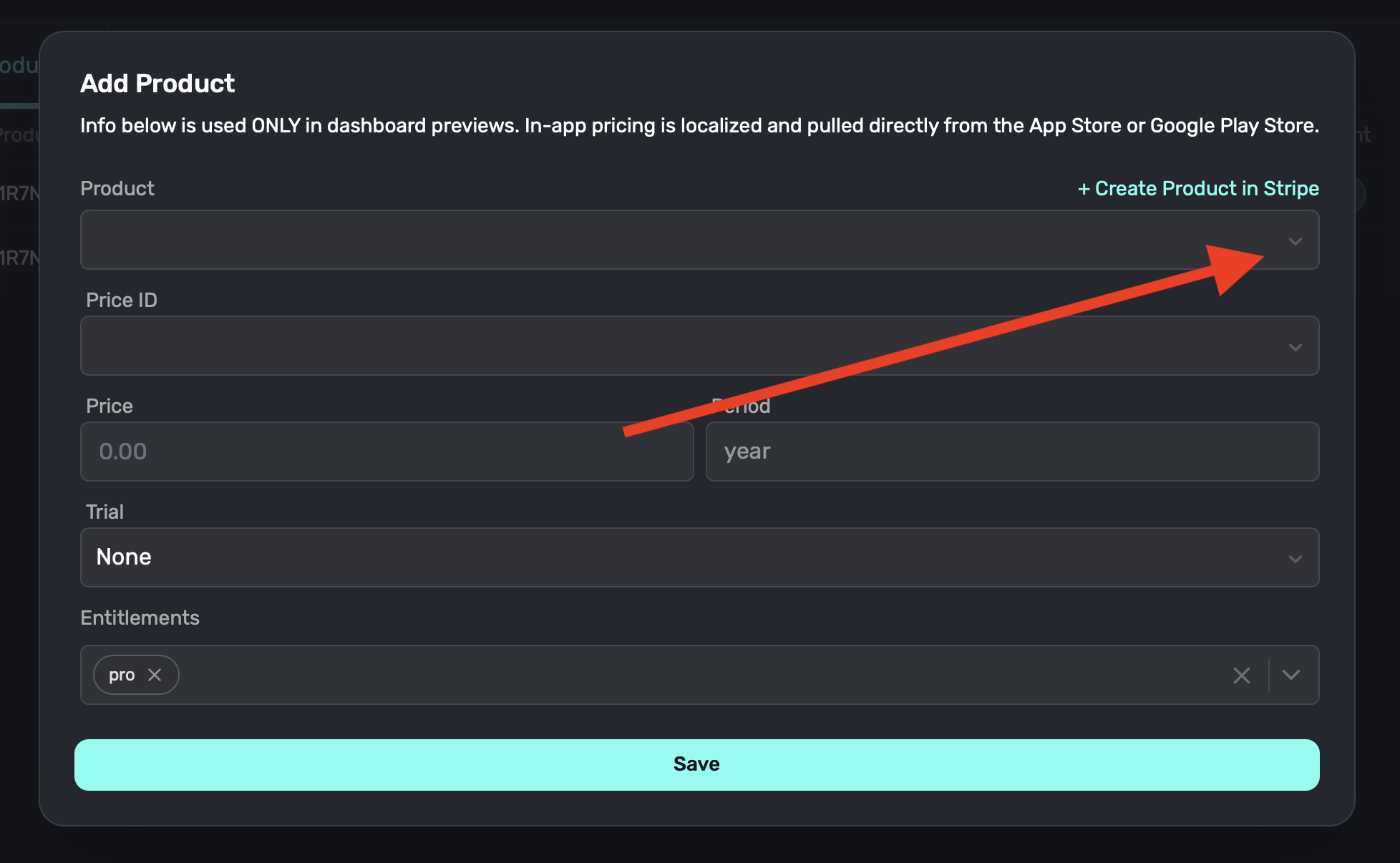 If you've already created products in Stripe, you can import them into Superwall now. All you need to do is select the "Product" and the rest of the fields should automatically populate with its data when you select them. You will need to choose which entitlement or entitlements a product should grant a user access to: