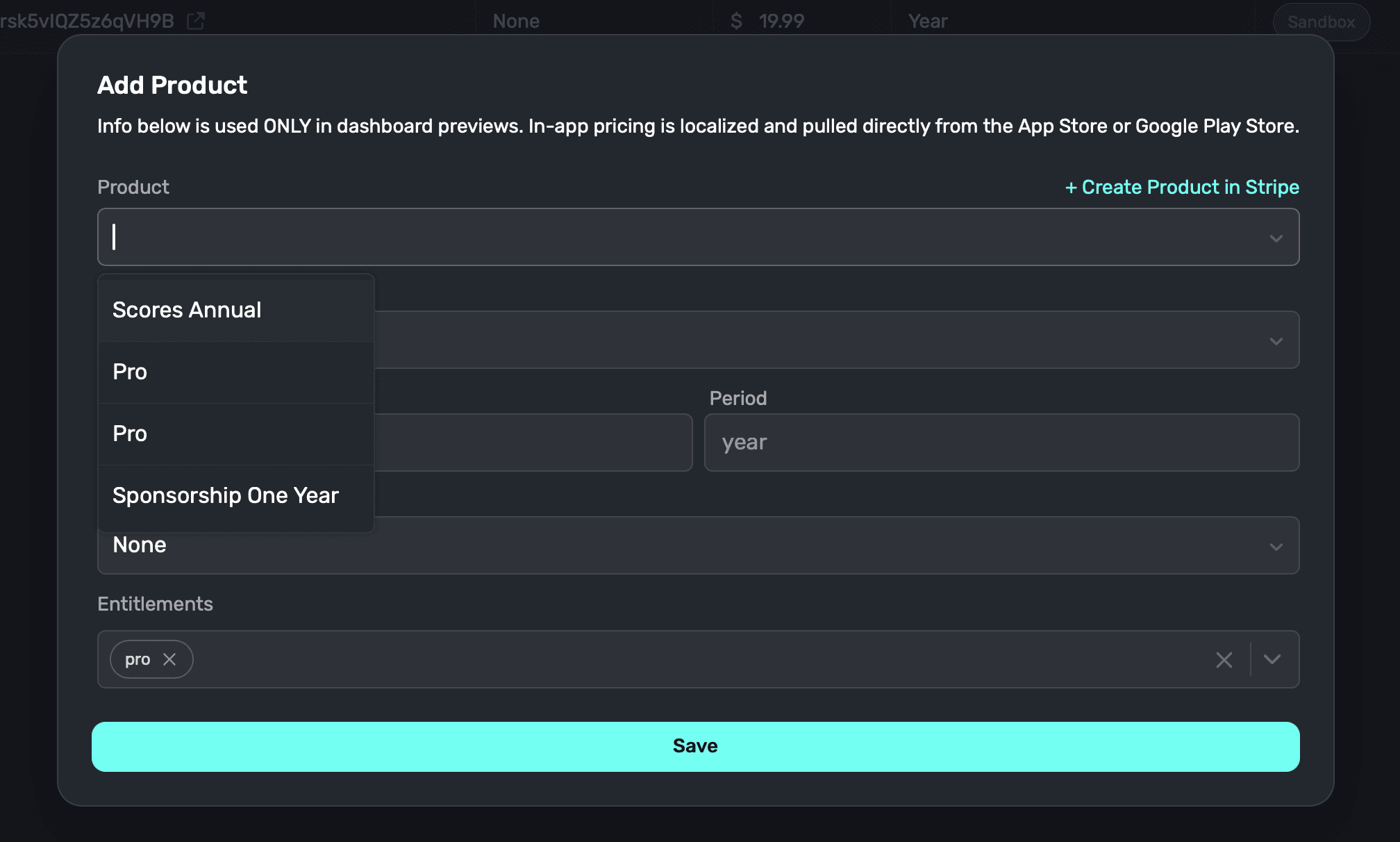 Now, when you return to Superwall, select your product from the Products drop down, and when you select the other fields, Superwall will pull in the data for you (aside from trials, which you choose when adding a Stripe product). Here, the new "Scores Annual" product created in Stripe shows up in the products menu now: