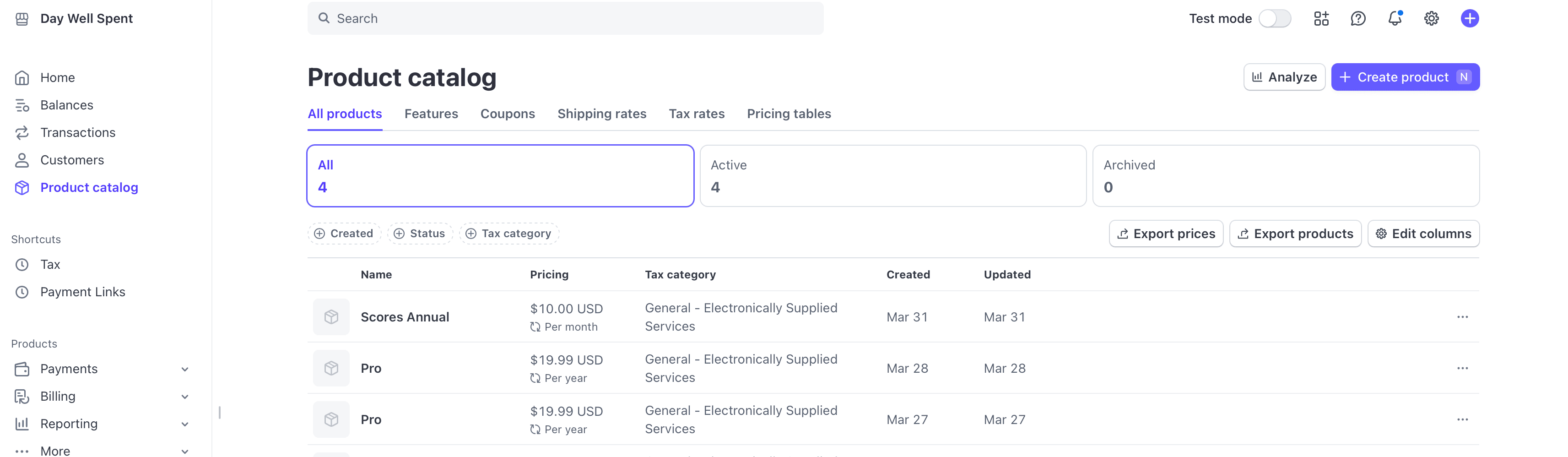 Once you've finished filling out pricing details, product name and all other metadata, click on the Add product button at the bottom right of the form. You should be redirected to your Stripe products page: